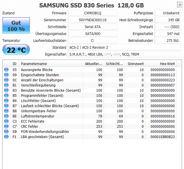 Zwei Fragen stelle ich mir selber, zum einen bei der SSD wieso haben die Punkte; Lesefehlerrate, ECC ot Fly, Unkor.Softwarelesefehler und Software ECC Korrektur immer die selben Werte zueinander wobei der Wert von Lesefehlerrate immer von Boot zu Boot anders ist, der Hexwert aller 4 Punkte ist aber immer gleich!?