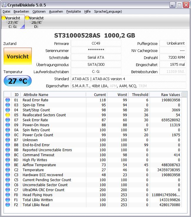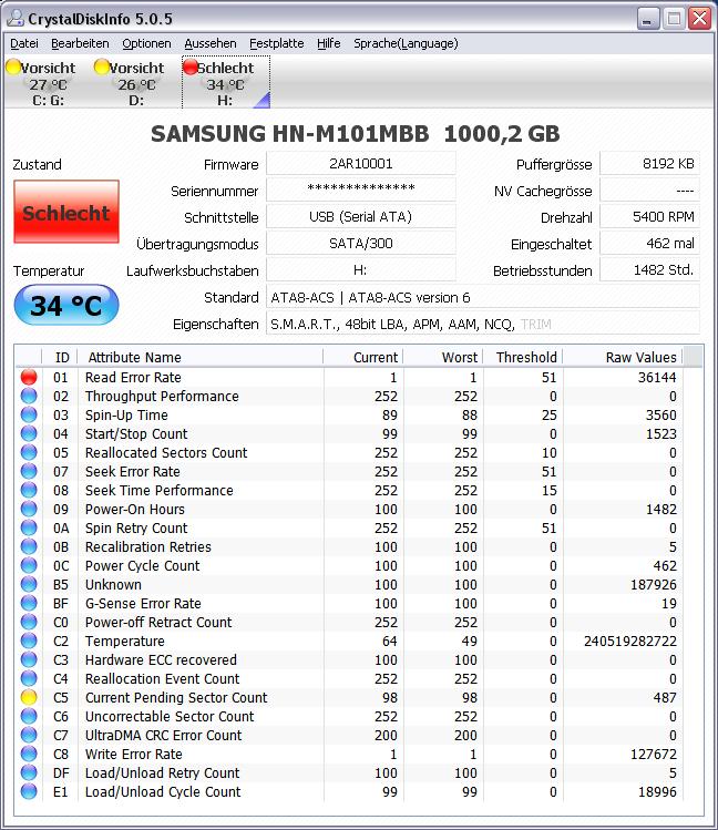 ich möchte meine HDDs neu arrangieren und eine zusätzliche neue kaufen. CrystalDiskInfo mahnt mich aber bei meinen beiden alten zur "Vorsicht". Jetzt stellt sich mir die Frage ob und welcher weitere Einsatz der Platten sinnvoll ist. Screenshots sind im Anhang.