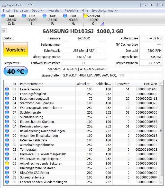Mit CrystalDiskInfo hab ich jetzt festgestellt, dass meine "alte" Seagate-Festplatte den Zustand: Vorsicht erhalten hat.