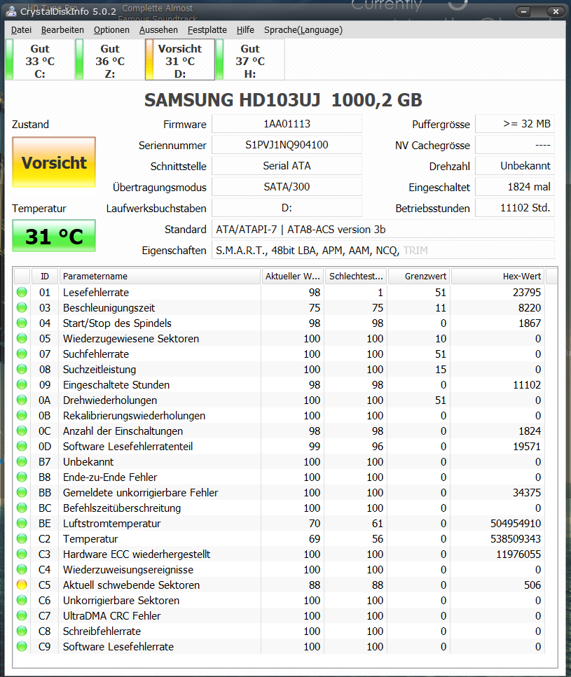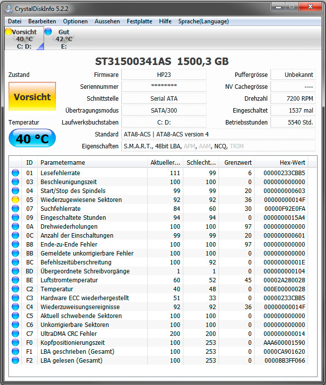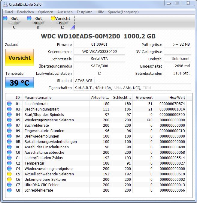 Ich verwende Win7. Nach Googeln bin ich auf diese Seite gestoßen und habe mir gleich CrystalDiskInfo installiert. Anscheinend scheint ja nicht mehr alles in Ordnung mit meiner Platte zu sein...