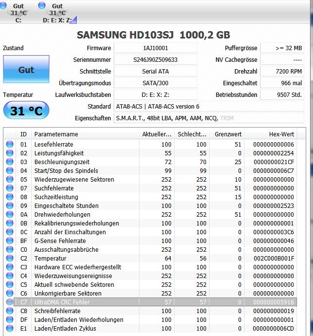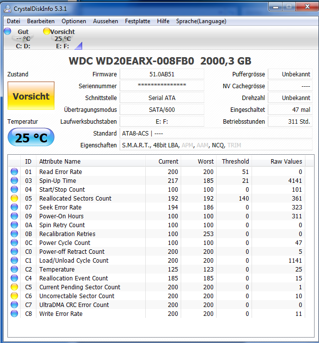 CDI zeigt "unbekannt" an, da die Smart-Werte nicht richtig bzw. nicht vollständig ausgelesen werden konnten. Die Threshold-Informationen fehlen z.B. vollständig. Das könnte an deiner Docking-Station liegen. Schließe die Festplatte mal direkt an deinen Rechner (intern) an und lies die Smart-Werte erneut aus. Der Defraggler hingegen interpretiert den bei Seagate Festplatten normalen hohen Raw-Wert der Suchfehlerrate falsch und geht aufgrund dieser Fehleinschätzung von einem Defekt aus.