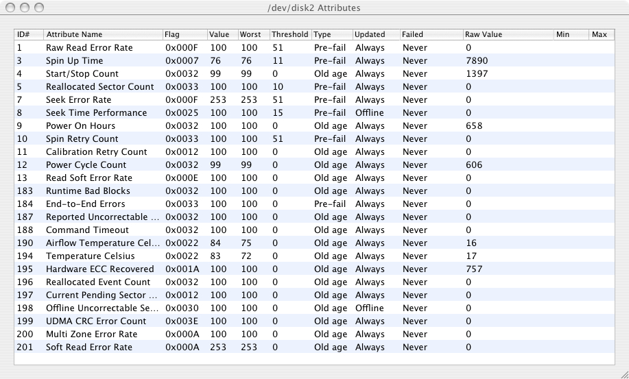 ID# ATTRIBUTE_NAME FLAG VALUE WORST THRESH TYPE UPDATED WHEN_FAILED RAW_VALUE