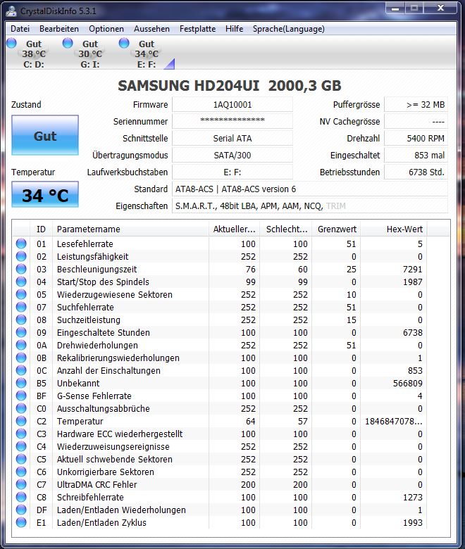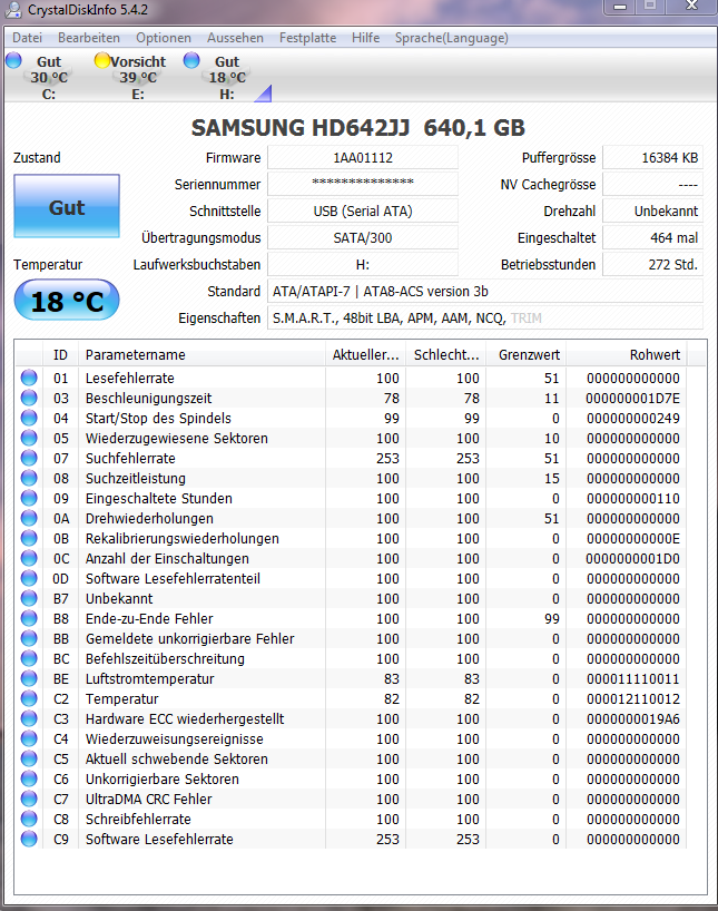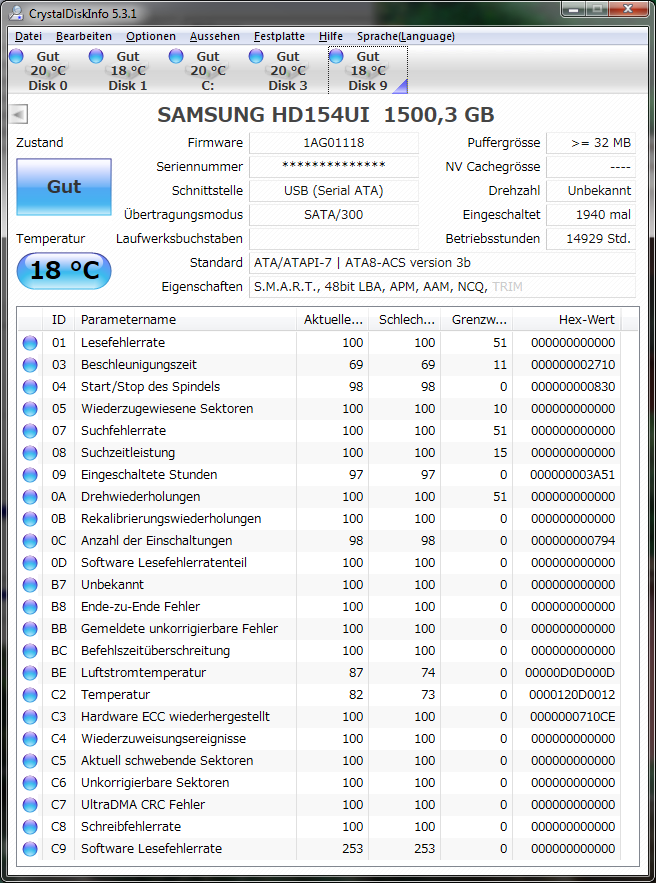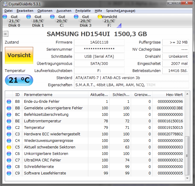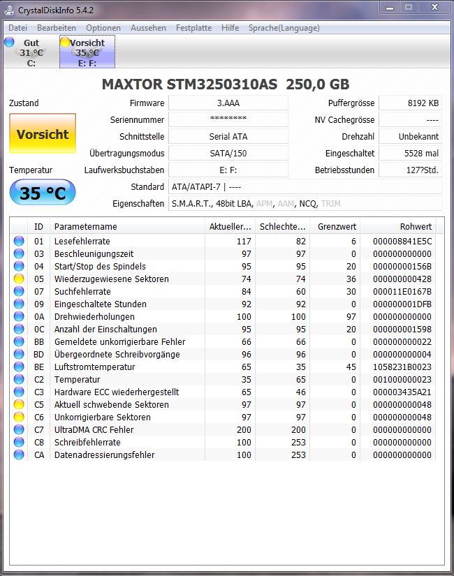 Die zweite HDD (SAMSUNG SP2514N) zeigt noch keine Probleme, wird aber auch als Gelb angezeigt.
