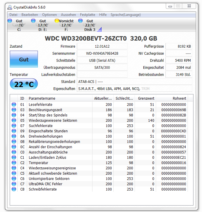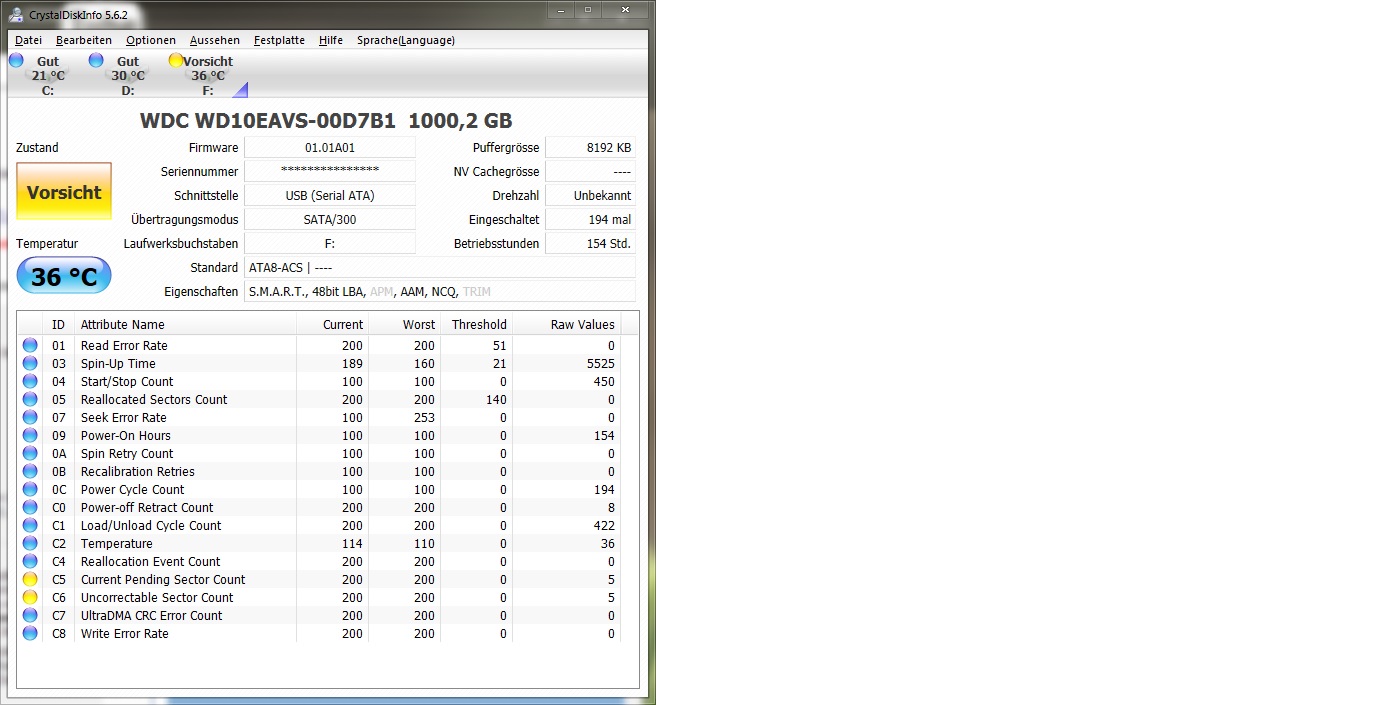 Eigentlich sehen für mich die S.M.A.R.T. Werte sehr gut aus, habe aber mir den unterschiedlichen Zahlen keine Erfahrung.