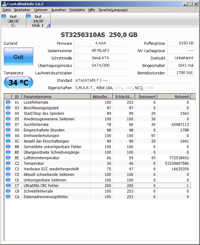 Nach HWInfo64 lief die Festplatte im Multi-Word Modus 2. Das hat mir erklärt, weshalb z.B. der Defraggler beim Defragmentieren der betr. Festplatte arg hing. Nach Bearbeiten von Registrierungseinträgen läuft die Festplatte jetzt im UDMA Modus 6, was schon merklich schneller ist (läuft auch mit SATA 300) aber es ist immer noch sehr langsam.