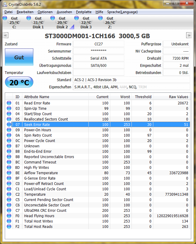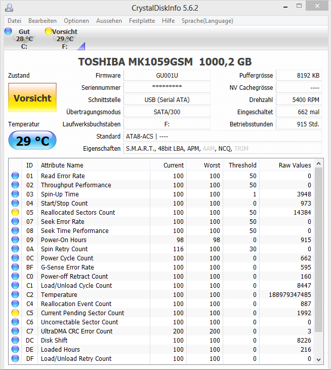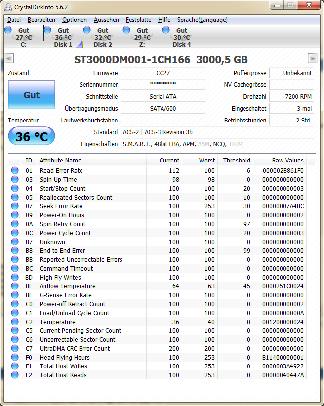 Für 1085 Betriebsstunden ist der Zustand unbefriedigend. Insbesonderes die Spin Retry Counts (0A) lassen ein mechanisches Problem vermuten, prüfe den Garantiestatus: