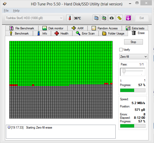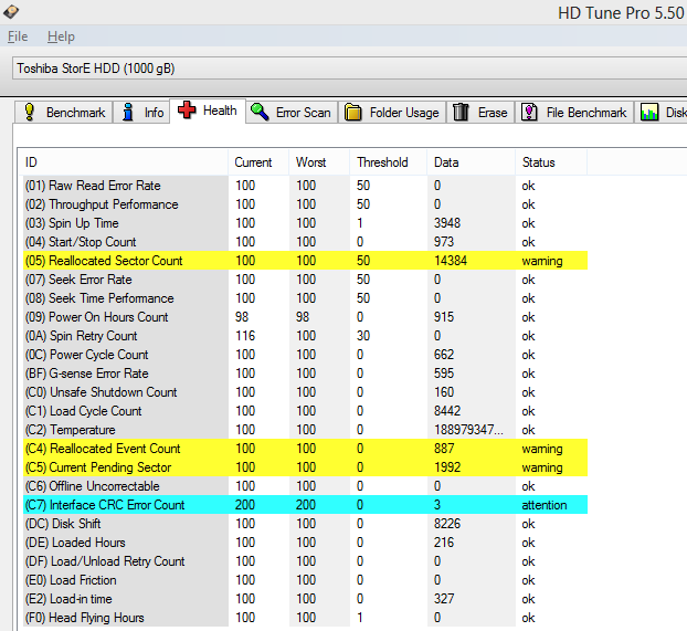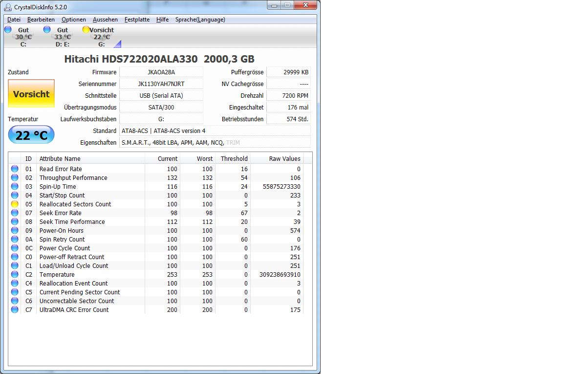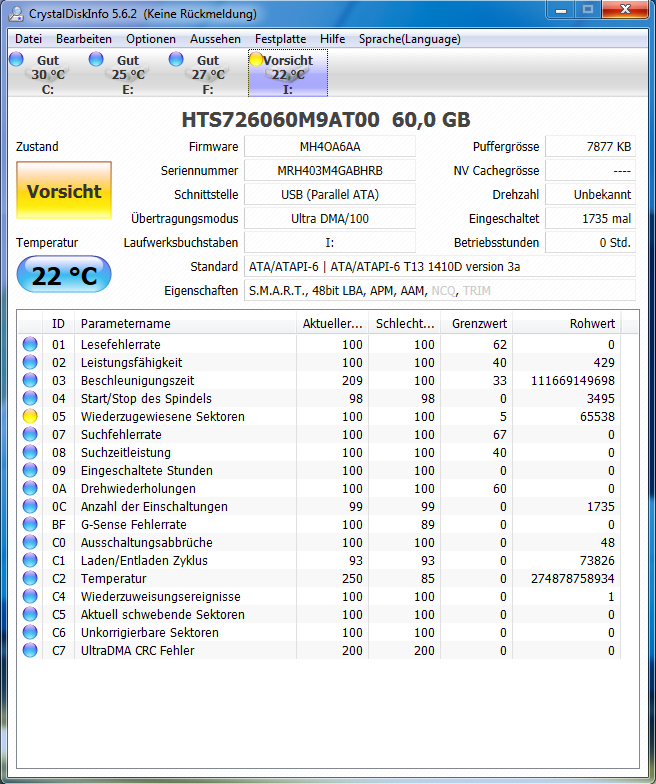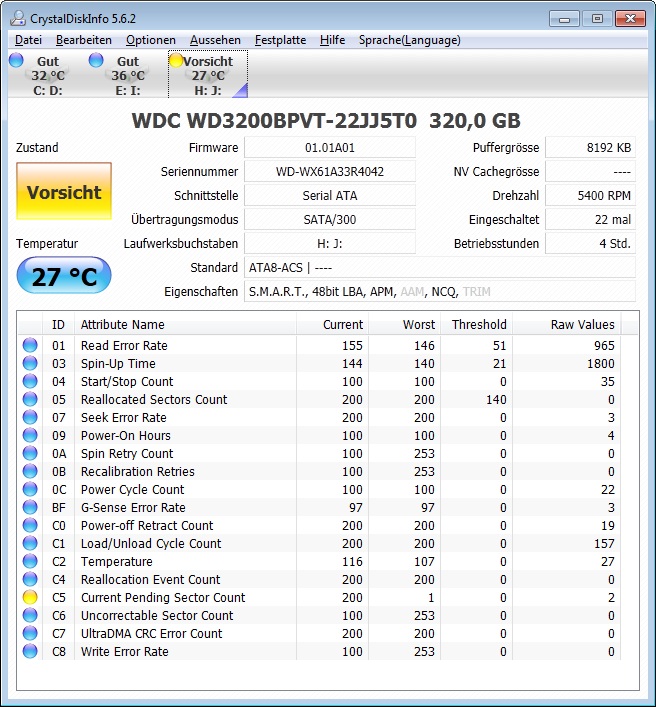 5 "schwebende" Sektoren (C5), bei denen noch nicht fest steht, ob sie defekt sind, diese wurden bei Selbstests der Platte gefunden (C6), ob sie durch Reservesektoren ersetzt werden müßen zeigt sich nach dem nächsten Beschreiben derselben.
