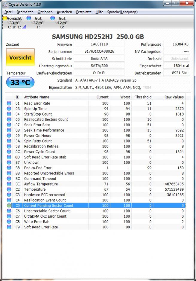 C5 Current Pending Sector Count: 679 Sektoren, die einmalig nicht gelesen werden konnten, das wird vorgemerkt, beim nächsten Schreibvorgang auf diese Sektoren wird der Wert zurückgesetzt, wenn geschrieben werden konnte, oder durch Reservesektoren ersetzt, falls nicht geschrieben werden konnte.