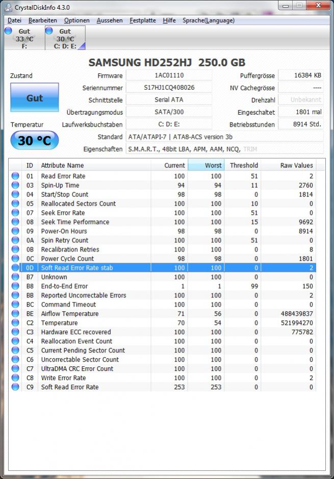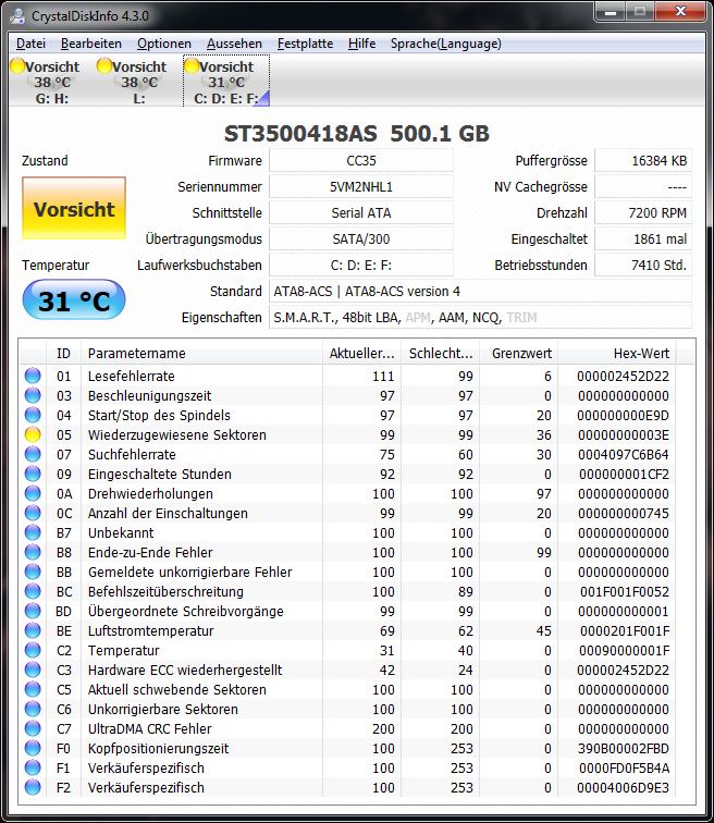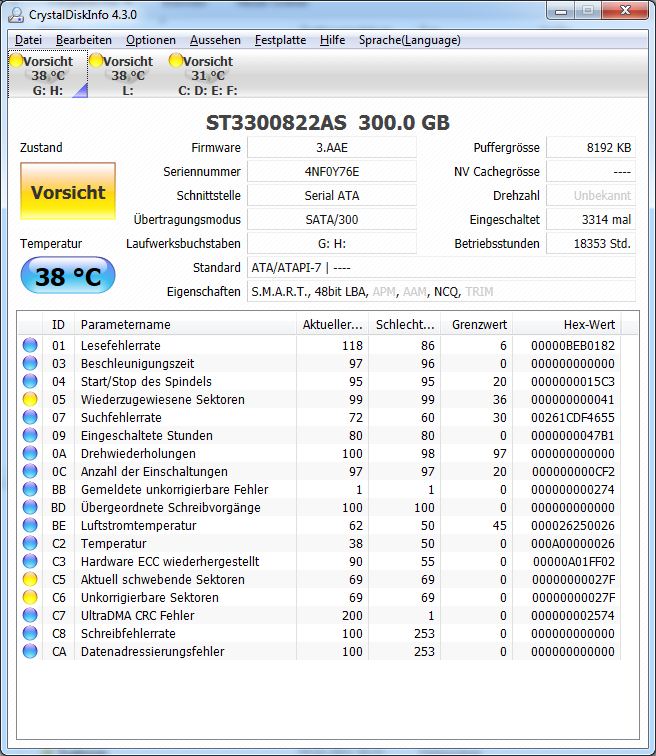 Die Spalte Aktueller.., Schlechtester.. und Grenzwert sind Tabellarische Werte, optimal ist je nach Hersteller und Parameter 100, 200 oder 253. Sinkt dieser Wert in Richtung Grenzwert ist das schlechter, wird der Grenzwert erreicht, gibt die Software "Failed/Bad/Schlecht" aus.