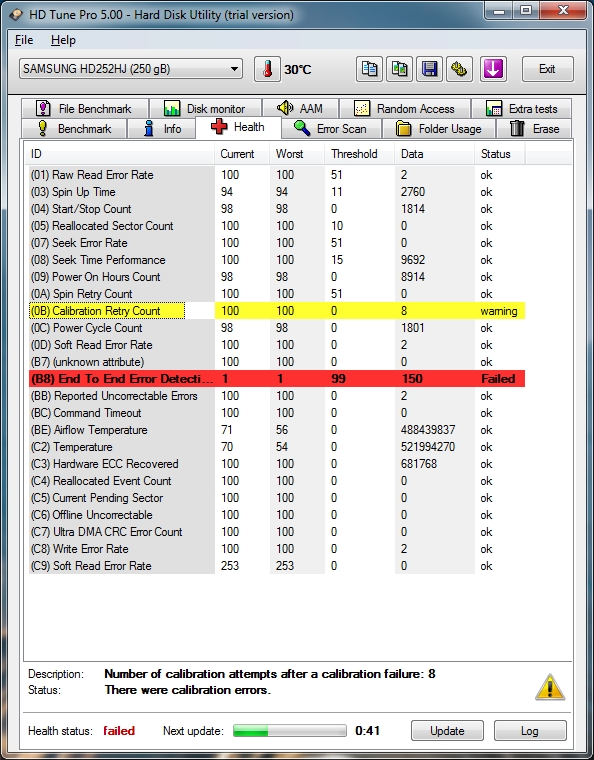 05 Reallocated Sectors Count: 65 defekte Sektoren wurden durch Reservesektoren ersetzt.