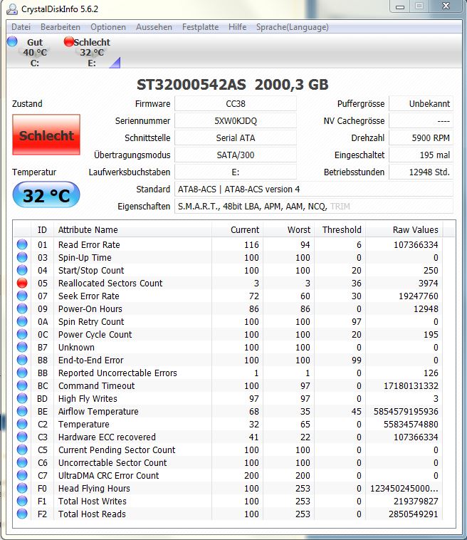 hallo, ich habe das probem dass meine 1500GB Seagate Barracuda Green 5900.3 ST1500DL003 5.900U/min 64MB
