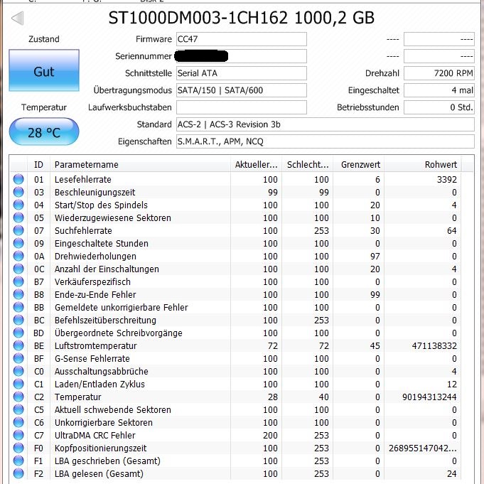 Danke. Gut, HDD i.O. Ich hielt die C5, 6, 7 für wichtig, die sind ja sogar als Rohwert auf Null. Allerdings kamen mir die anderen Rohwerte seltsam vor. Zumindest kenne ich das von Samsung oder WD anders. Hier bei der Seagate kann man ja noch bei der Temperatur vom "Rohwert" Hex 24 auf "Aktuell" 36 °C schließen. Mich wundert einfach, dass die sich riesig ändernden Rohwerte bei Lesefehlerrate und Suchfehlerrate keine Änderung bei "Aktuell" erzeugen.