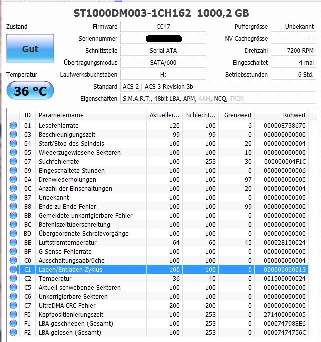 Ich habe das mal gekürzt mit den wichtigsten Infos. Diese HDD wird laut Crystal Disk Info mit gelb und Vorsicht angezeigt.