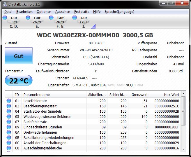 Kann man sich auf die Werte von CrystalDiskInfo verlassen was Betriebsstunden angeht? Der Screenshot unten ist von einer WD Green 3 TB, die ich als Neuware bei MF bestellt habe und soeben das erste mal per Docking Station mit dem Rechner verbunden habe. Wenn der Wert tatsächlich stimmen sollte kann ich mal stark davon ausgehen, dass die mir Gebrauchtware angedreht haben? Ich habe 2 bestellt, sobald der Test bei dieser hier durch ist, werde ich mir die Werte der zweiten einmal anschauen. Aber momentan hab ich eher ein mulmiges Gefühl muss ich sagen.