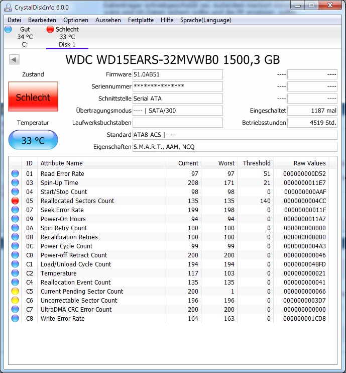 Ich habe den "Fehler" im Anhang, nun stellt sich die Frage: Einschicken oder nicht? Ich hatte eigemtlich kein Problem mit der HDD und laut dem Samsung bzw. Seagate Tool ist alles ok.