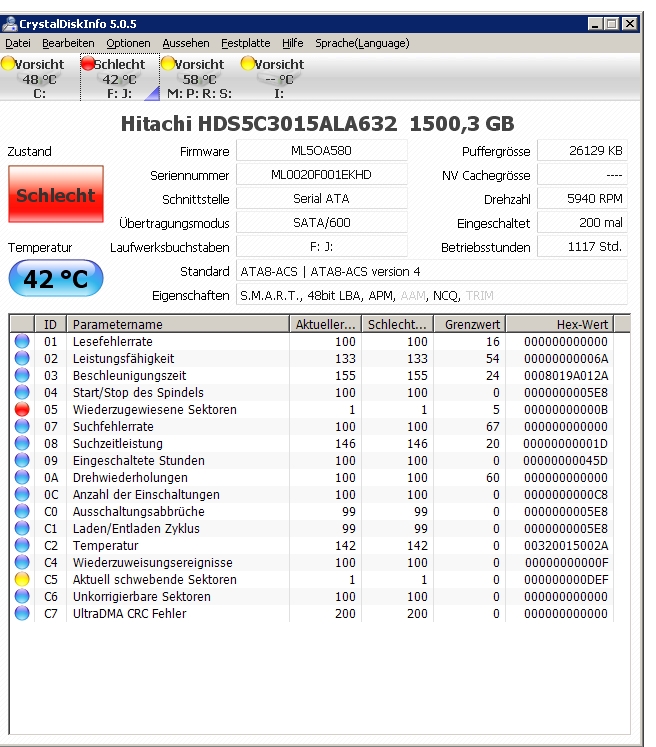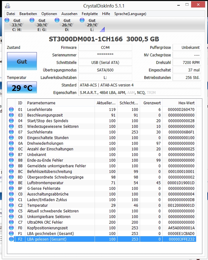 Inzersdorfer schrieb:Das ist bedeutungslos, gezählt wird hier das Entladen der Schreib/Leseköpfe in einem nicht näher definiertem "unsicheren" Modus als Submenge von C1 Laden/Entladen Zyklus (Bei anderen Hitachi Baureihen sind C0 und C1 immer gleich).