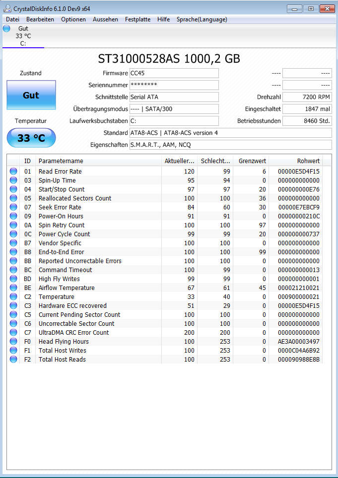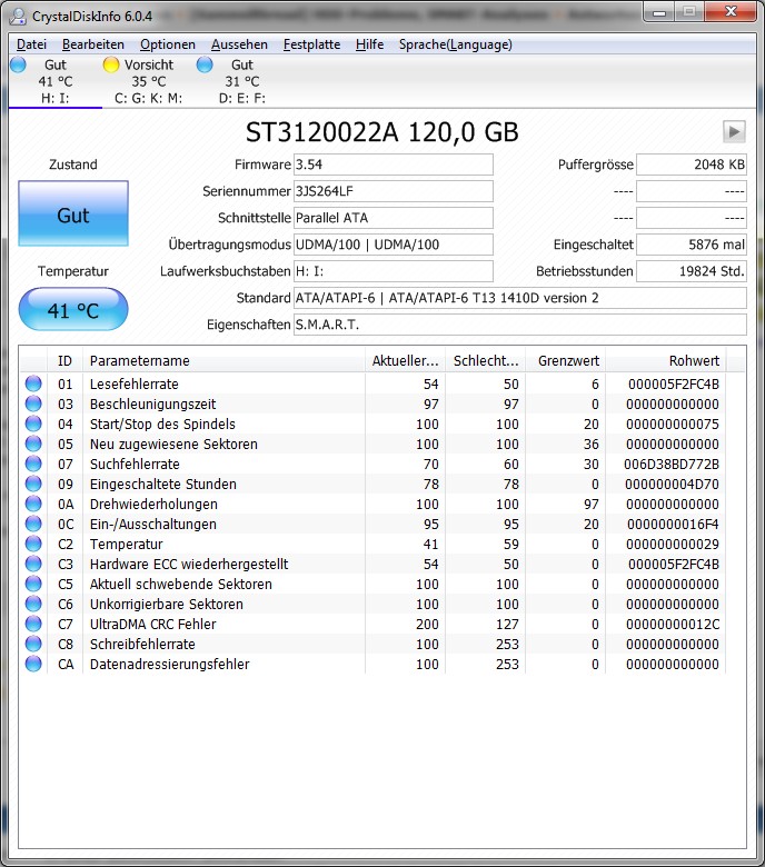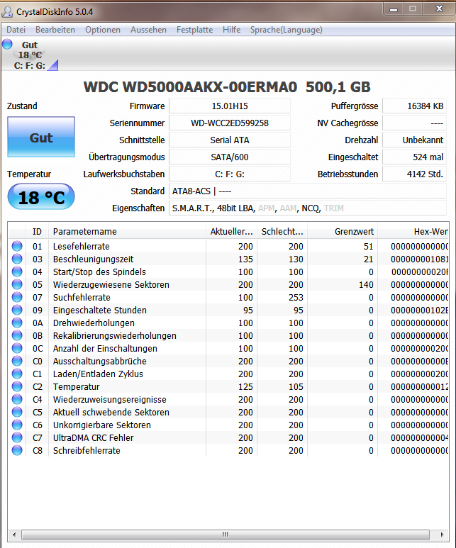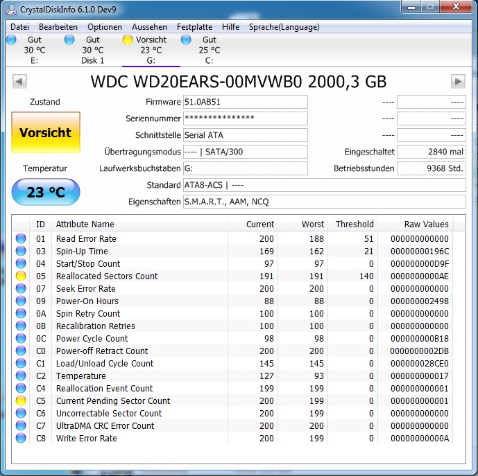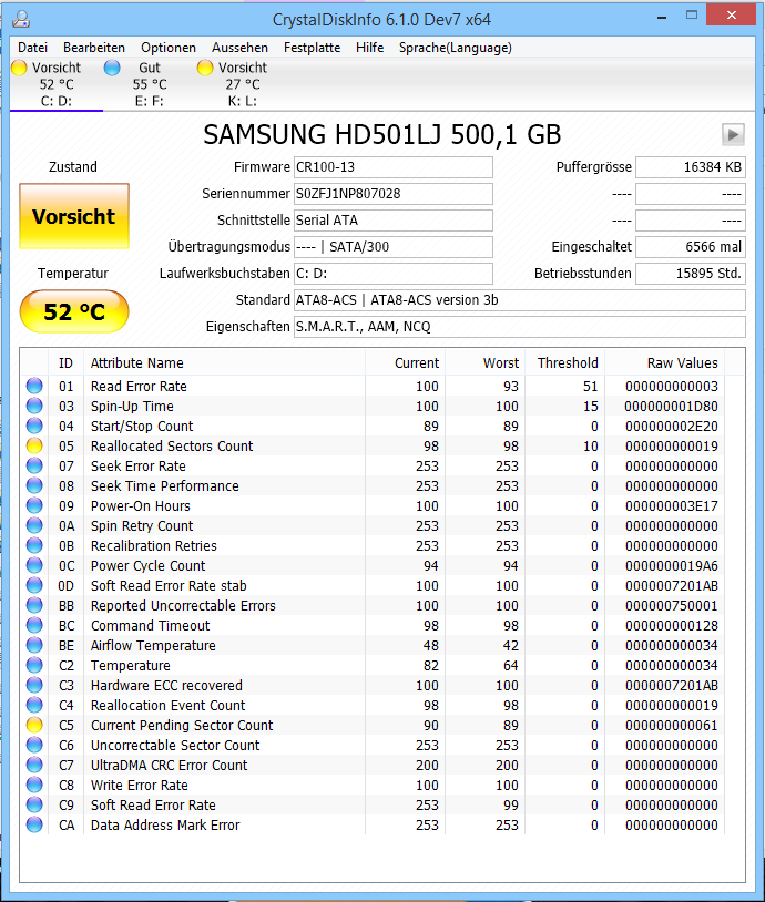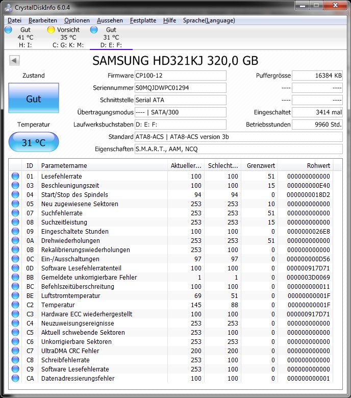 Die Samsung Platte, auf der das Systemlaufwerk C: ist, hat einen schwebenden Sektor (deshalb auch CDI "Vorsicht").
