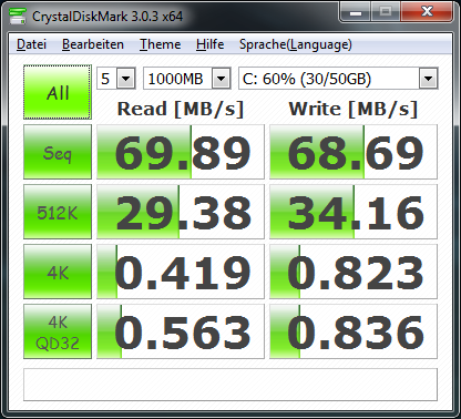 Ich könnte mir auch noch vorstellen, dass die Partition C: vielleicht ganz hinten auf dem Laufwerk liegt (eigentlich komisch, aber es könnte sein). Wenn dem so ist: hinten (also innen) werden Festplatten immer langsamer, das ist normale Physik.