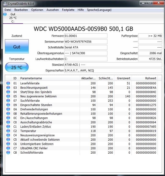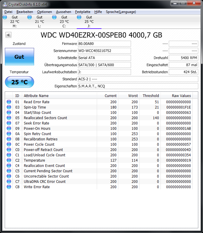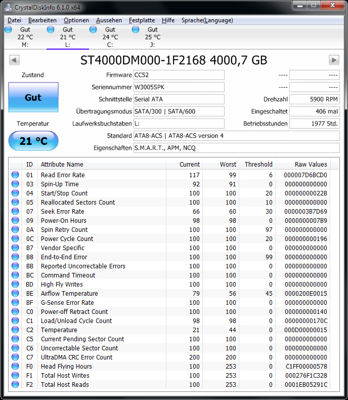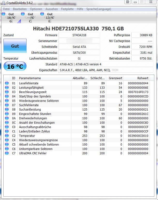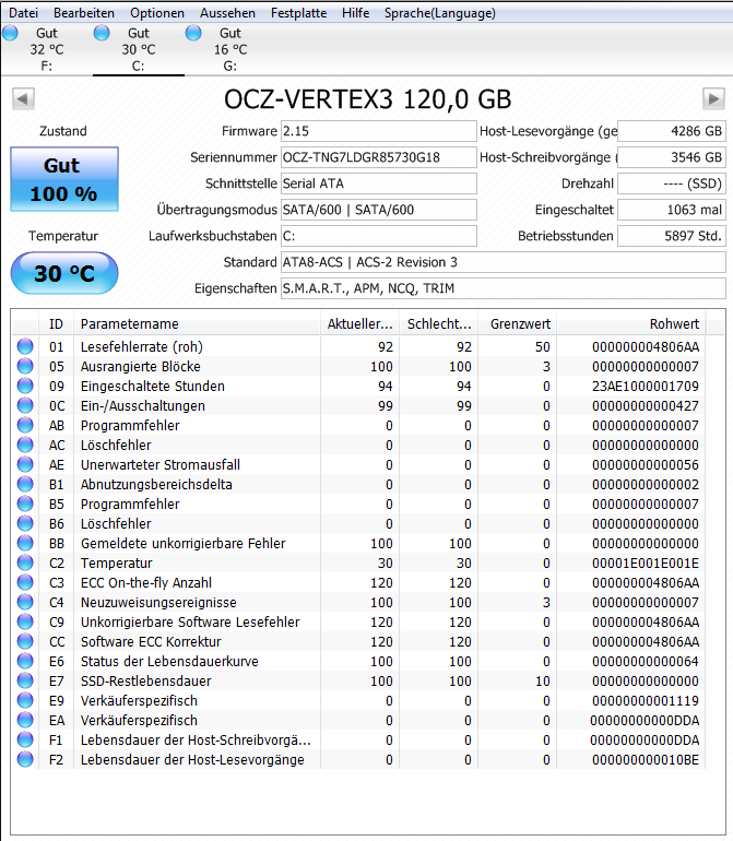 Platte 2 (SSD): 0x05 /0xC4: 7 Sektoren wurden durch Reservesektoren ersetzt. Das klingt nicht viel, allerdings bin ich bei FLASH-Speichern etwas skeptisch.