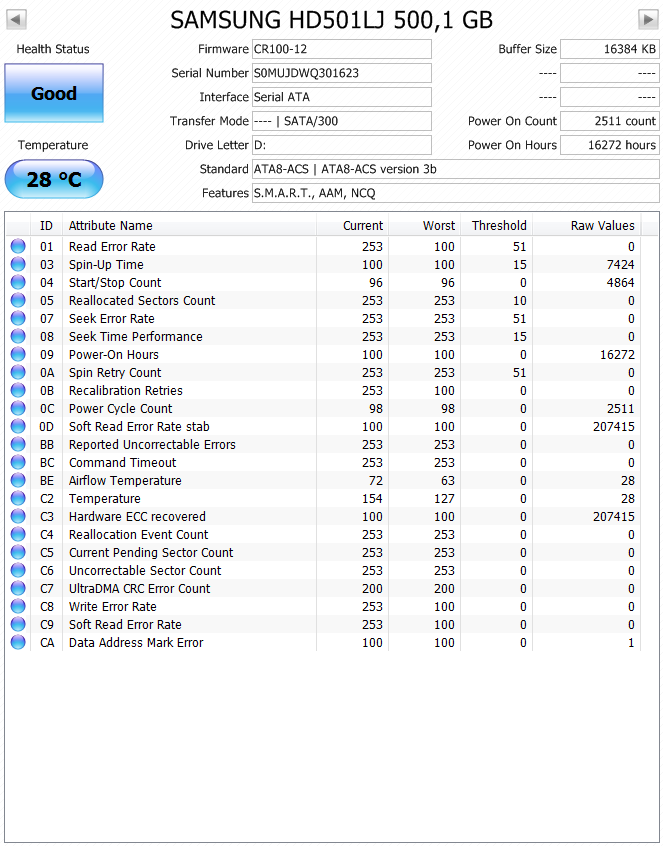 mir ist heute aus Zufall aufgefallen, dass ich noch zwei Festplatten a 500GB aus dem Jahre 2007 in meinem PC habe, welche auch noch kräftig am Gesamtsystem mitwirken. Ich habe mir dann mal CrystalDiskInfo runtergeladen und nachgeschaut. Der Zustand ist angeblich noch "good". Nicht desto trotz gibt es ein paar sehr hohe Werte dort, mit denen ich aber leider nichts anfangen kann. "Current" würde ich als jetzt gerade vorhandenen Wert einschätzen. Allerdings gibts ja dann den "Threshold" -Wert, welcher i.d.R. vom Current überschritten wird?! Und was hats mit dem Raw Values -Wert auf sich? Kann mir das vielleicht mal irgendwer erklären, was es damit auf sich hat?
