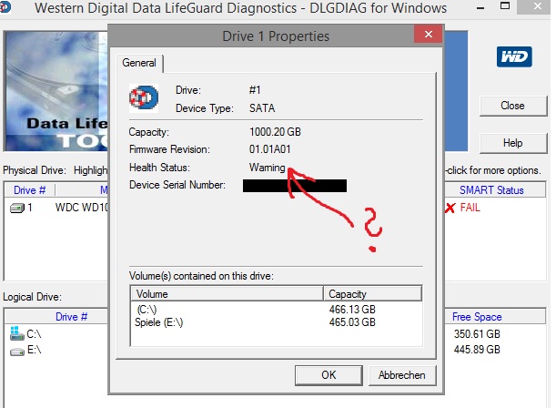 Dabei ging es um diese Fesptlatte, über die das WD-Diagnose Tool aussagte "SMART Status: Fail". Andere Fehler schienen aber nicht aufzutreten.