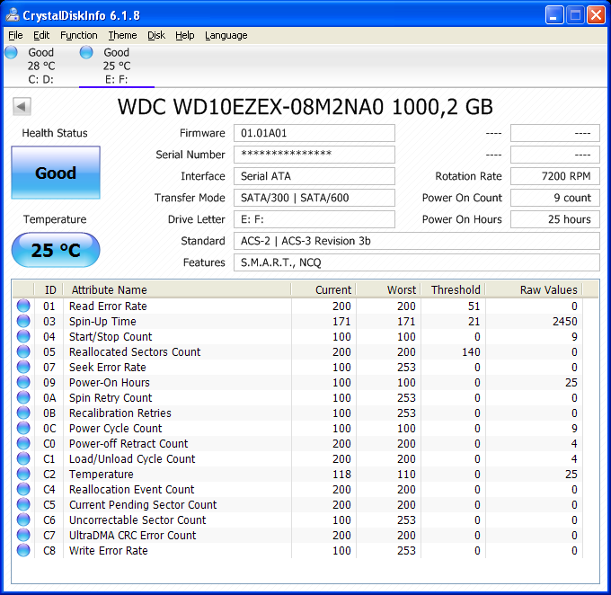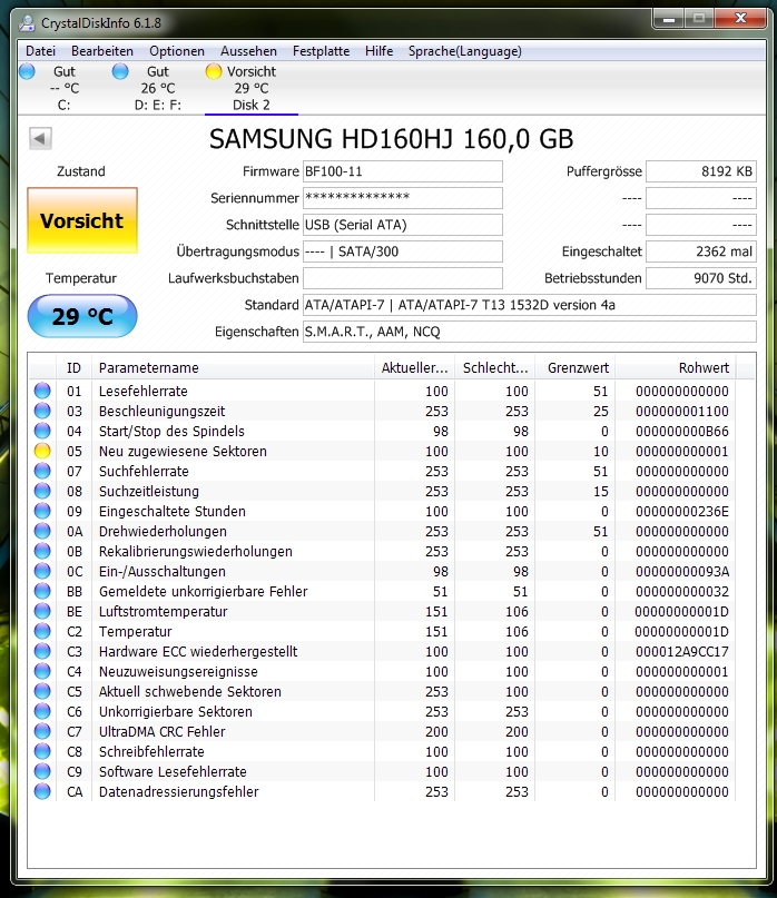 Auch CrystalDisc zeigt mir an, dass alles okay ist…keine reallocated sectors oder pending sectors.