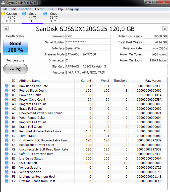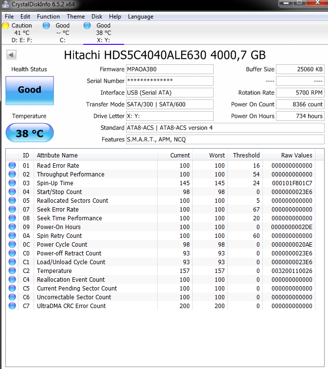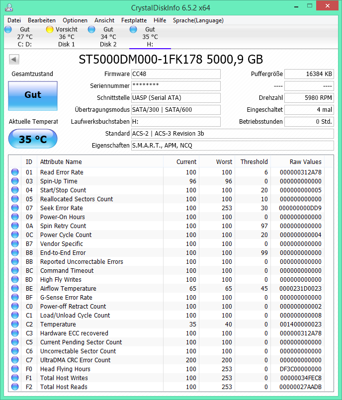 Und ja nach Attribut, dann es gibt auch Platten wo der Ausgangswert für den Aktuellen Wert für ein Attribut 100 und bei einem anderen 253 ist. Daher lohnt es sich nicht nur gleich beim ersten Einschalten/Einstecken einer neue Platte auf die S.M.A.R.T. Werte zu schauen um zu sehen ob die Platte wirklich neu und fehlerfrei ist, sondern den Screenshot der Werte auch zu speichern, damit man im Zweifel später nachsehen kann, welches denn der Ausgangswert war. Wenn ein Aktueller Wert auf 99 steht, ist es eben ein großer Unterschied ob der von 100 oder von 253 auf 99 gefallen ist.Inzersdorfer schrieb:wobei der optimale Wert 100, 200 oder 253, je nach Hersteller und Modell, ist.