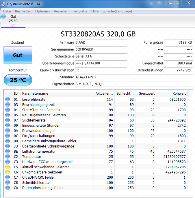 Die Chancen stehen dann wirklich gut, Garantie gibt es aber keine.Janik2009 schrieb:In der Tat, weder C5 noch C6 haben sich verändert, noch immer jeweils eine 8 in der Spalte Raw Values. Vielleicht habe ich ja wirklich Glück und weder Daten noch Hoffnung müssen den Löffel abgeben![]()