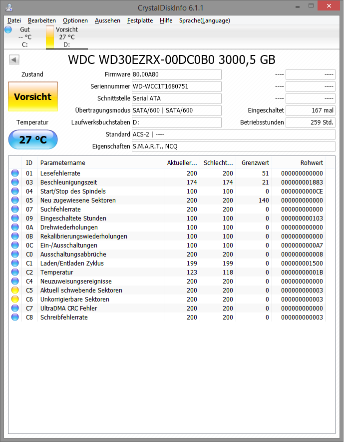 Um genau zu sein, ist dies in meinem Fall das erste Mal, dass eine Platte nach so kurzer Zeit schon solche Symptome zeigt. Abgeraucht ist mir überhaupt erst eine Platte, und zwar eine 2006 gekaufte Seagate nach immerhin 3 Jahren. Von daher bin ich noch relativ entspannt.