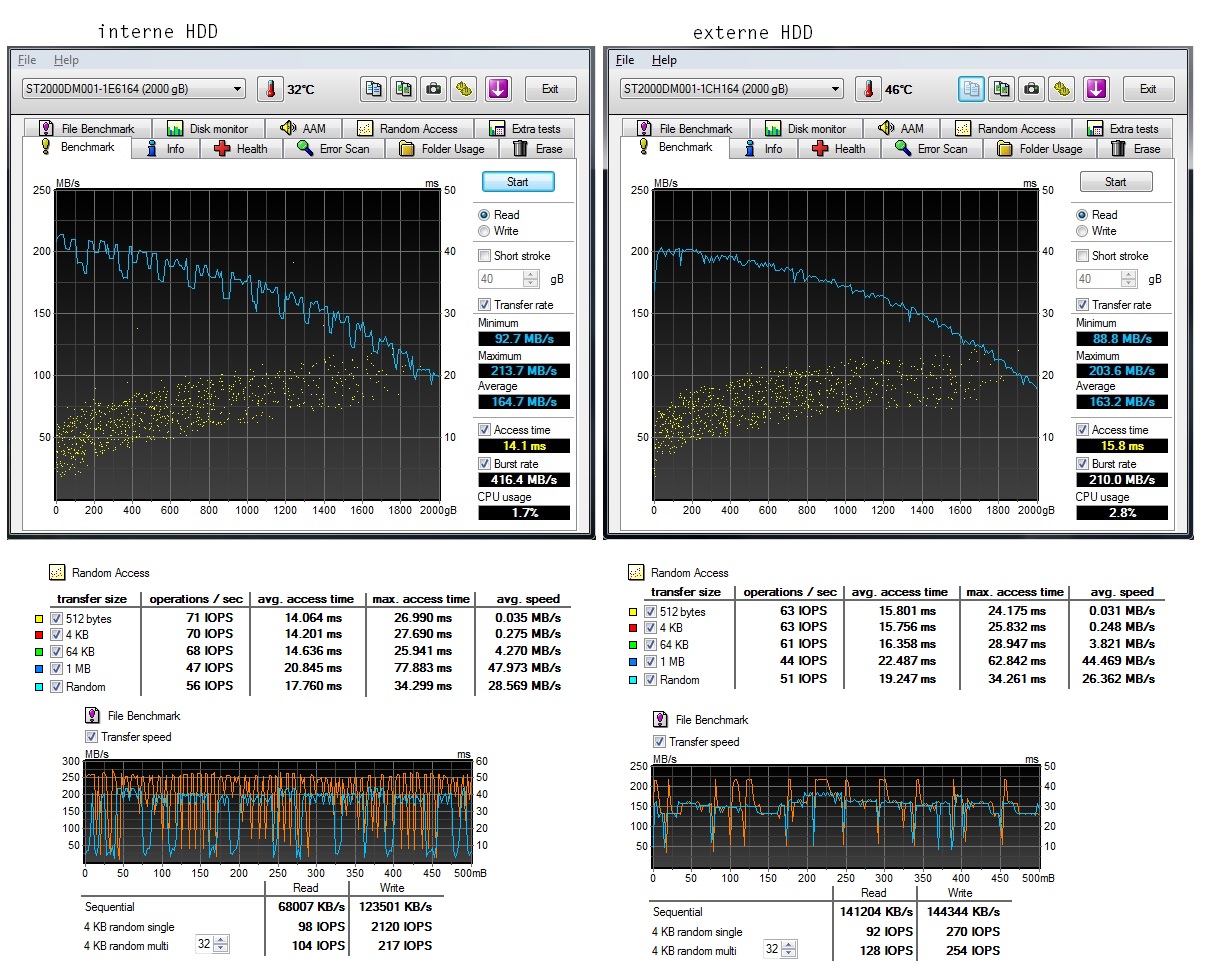 Die Werte passen und wie Du siehst sind je nachdem wo die Dateien liegen, maximal 100 bis 200MB/s möglich. Auffällig ist in der Tat die Diskrepanz bei Lesen und Schreiben der internen HDD, dafür ist aber offenbar nicht die Platte verantwortlich, da diese ja im Low-Level Benchmark die normalen Leseraten erzielt. Daher könnte es eine Datenkompression, -verschlüsselung, der Virenfinder oder ein Service wie der Indexierdienst sein, die dort beim Lesen bremsen, weil das Schreiben von Dateien bei der internen diese auf den Plan ruft.