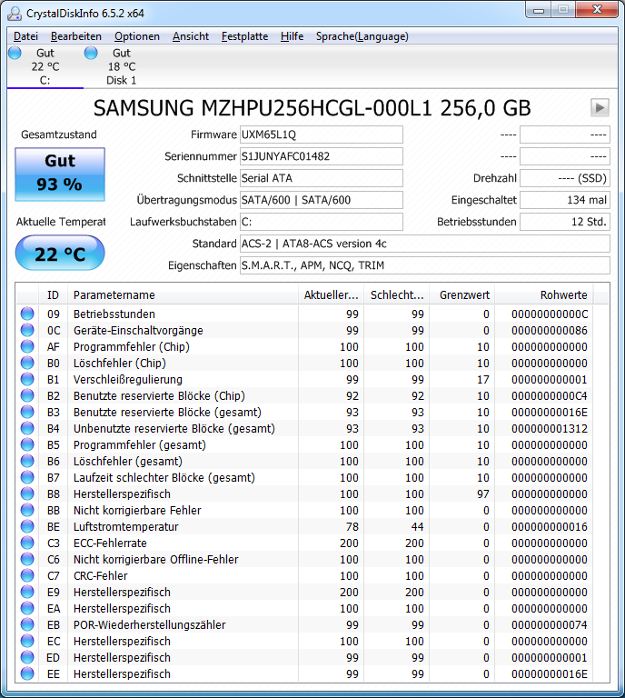 Also kein Grund zur Sorgen, die Werte sehen soweit gut aus, sofern die Namen der Attribute bekannt sind und passen. Achte auf die Werte AF, B0 und B7, die zeigen Dir dann an, ob es zur Laufzeit Probleme mit den NANDs gab und auf B1, die Verschleißanzeige der NANDs.