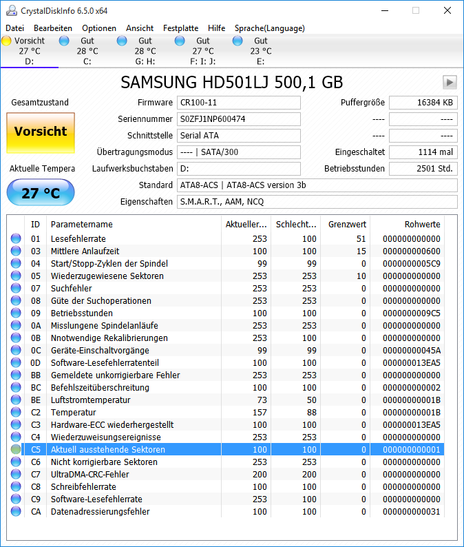 Nachdem beide HDDs später durch ChrystalDiskInfo nach Inaktivität aus dem Standby geweckt wurden, war bei der "Problem-Platte" oben nur ein graues Laufwerk (anstatt blau) anzuklicken, unten standen dann keine weiteren Infos (HDD lief wieder, wurde "vom PC bemerkt", aber war nicht weiter erreichbar). Testweise hatte ich mal den PC runtergefahren. Auch das bemerkte die HDD nicht und lief weiter (LED war aber aus), das "heile" Pendant ging aus wie immer. Nun war aber auch bei ihr ein von 0 geänderter Wert bei BC / "Befehlszeitüberschreitung" (vllt. habe ich den Aussetzer auch nicht bemerkt).