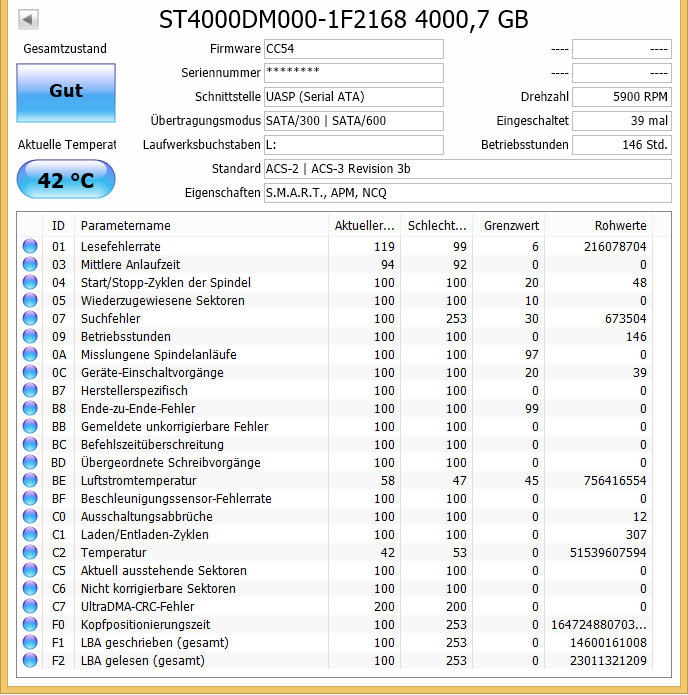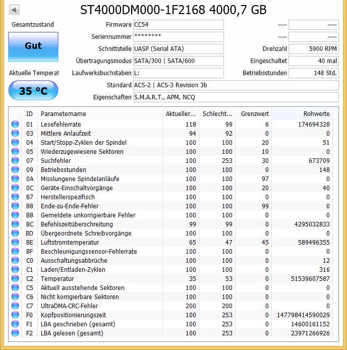 ich habe zwei Seagate Expansion Desktop 4TB-HDDs, von denen eine sich vorhin nicht mehr ansprechen ließ (LED an, HDD lief, aber kein Zugriff über den Explorer (Win 8.1)). Nachdem ich das USB-Kabel einmal gezogen und neu verbunden hatte, ging es erstmal wieder. In ChrystalDiskInfo fiel mir der hohe Wert bei BC / "Befehlszeitüberschreitung" auf, den ich hier bisher noch nicht gesehen hatte.