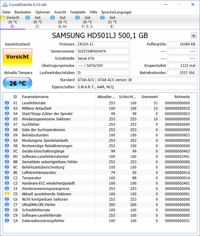Ich hatte Anfang des Jahres eine 3TB Seagate (ST3000DM001) zum Austausch geschickt wegen schwebenden Sektoren und so ähnlich. Nun hab ich bei der neuen Platte laut CrystalDiskInfo schon wieder gelbe Bereiche. Dabei hab ich nichtmal wirklich viel darauf rumgeschrieben. Garantie hab ich wohl nicht mehr nach dem Austausch. Die letzte Platte war ja auch schon 2 Wochen vor Ablauf.