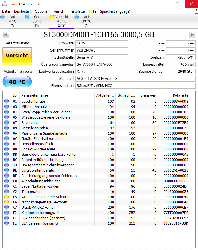 Die Werte der Platten sind absolut in Ordnung und unkritisch, vielleicht hat das Gehäuse ein Problem, aber die Platten sind soweit ich das sehen in Ordnung. Stelle auch Hexdezimale Anzeige der Rohwerte um, dezimale Rohwerte machen bei Seagate HDDs wenig Sinn.