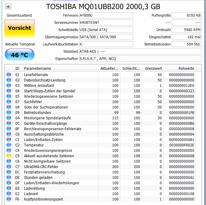 Solange dort mehr Sektoren schweben als die Warnschwelle ist, ab Werk ist das auch 1 eingestelt, wird dort Vorsicht stehen und das besagt eben, dass man die Werte im Auge behalten sollte, es sagt nicht, dass die Platte Schrott ist.