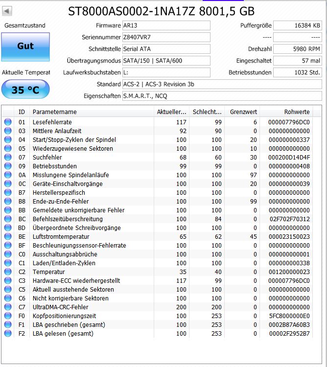 Wie kommst Du darauf? Kann es sein, dass Du die Raw_Read_Error_Rate und Seek_Error_Rate falsch interpretierst? Keine Sorge, kein der beiden Platte hat einen Lese- oder Suchfehler, die Rohwerte zeigen nämlich nicht nur die Anzahl der Fehler, sondern auch die der Vorgänge (in den hinteren 4 Bytes) an. In der hexadezimalen Anzeige erkennt man das besser.