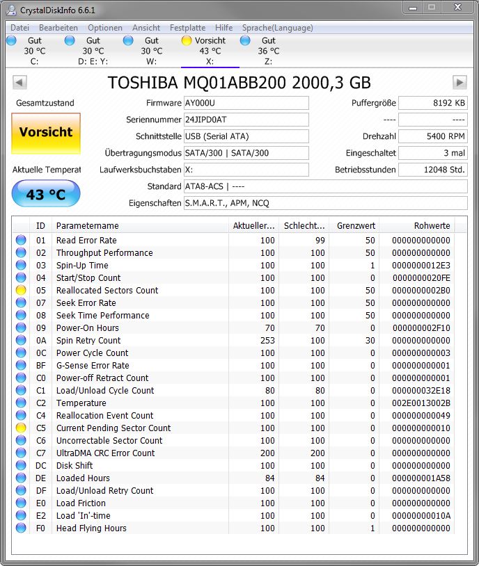 Das sind einfache Desktopplatte und die sind nicht für den Dauerbetrieb geeigent oder ausgelegt, die eine hat ja auch schon reichlich Stunden runter. Dafür ist der Zustand bis auf die 6 High-Fly Write noch sehr gut, obwohl sie mal 71°C warm geworden ist, was klar zu heiß war.