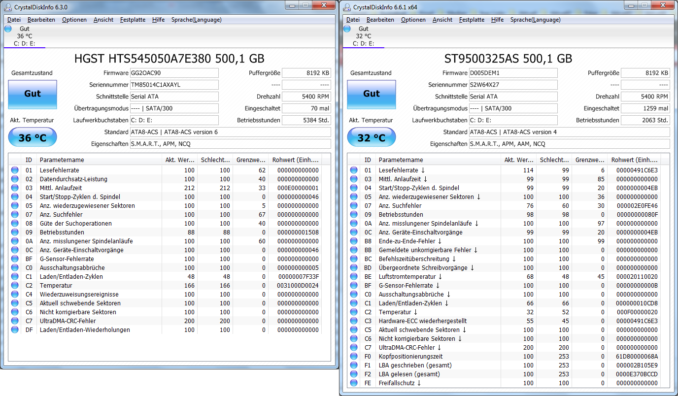 Ich hätte mich auch für die HGST entschieden, wenn die Anzahl der Laden/Entladen-Zyklen nicht so enorm wäre. Umgerechnet hat die HGST alle 37 Sekunden einen Laden/Entladen-Zyklus durchgeführt. Ich dachte, von solchen Phänomenen sind nur WD-Festplatten betroffen. Die HGST lief in einem Notebook, das über einen längeren Zeitraum bei Nichtbenutzung auch teilweise über Nacht nicht abgeschaltet wurde.