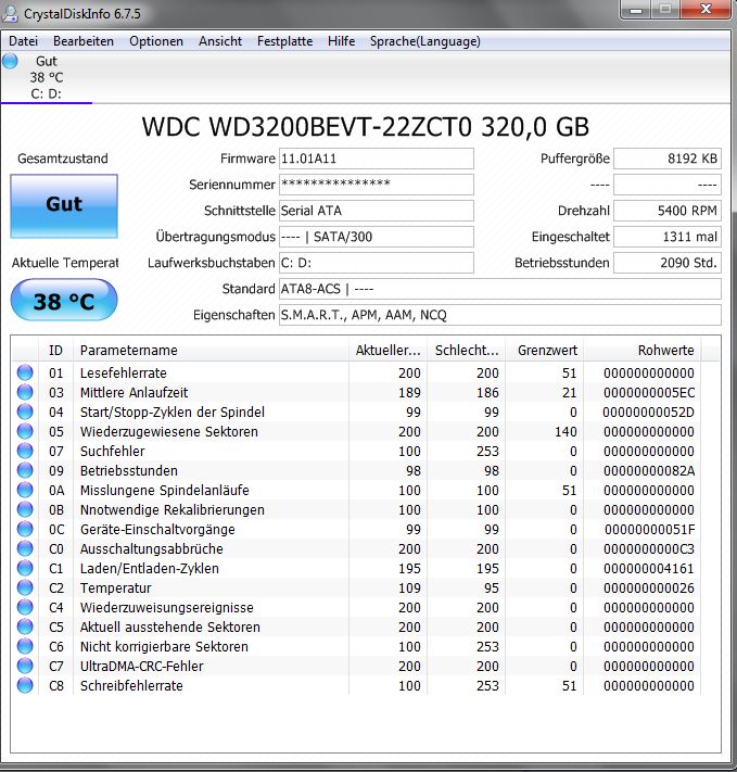 Vor allem aber hat die HDD eine Menge Ultra-DMA CRC Fehler, da stimmt also was mit dem Datenkabel nicht! Beobachte mal den Rohwert von Attribut C7, wenn der sich ändert ist das Problem akut und dann sollte geprüft werden, ob beide Ende des Kabel korrekt sitzen und wenn ja, das Kabel entsorgt und durch ein neues ersetzt werden.