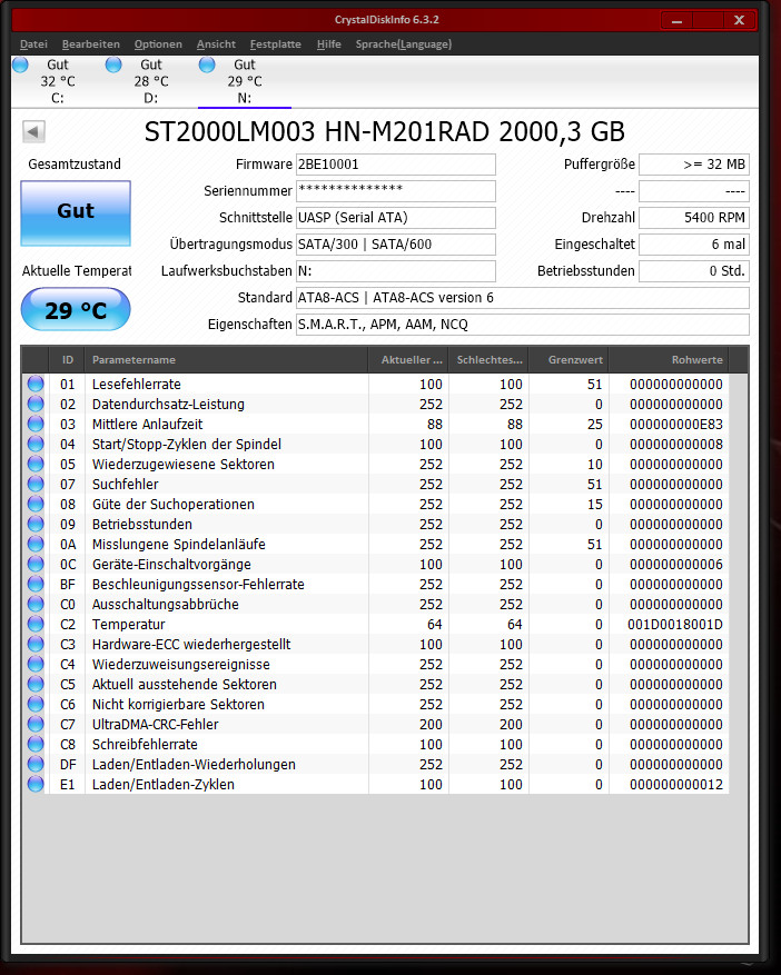 1) neue HDD angeschlossen und SMART-Werte ausgelesen --> ("seagate_2TB_1st_SMART_SGxM2nd.jpg")