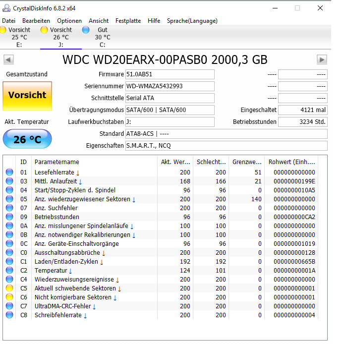 Nein, der Rohwert vom Attribut C7 ist 0, also gab es nie Probleme bei der Kommunikation zwischen dem SATA Host Controller und dem Controller der Platte. Die Ursache liegt eher nicht bei der Platte, er wird da woanderes suchen müssen.Banger schrieb:Vielleicht ist das Verbindungsstück zwischen Platte und Mainboard im Eimer oder der Sata-Controller?
