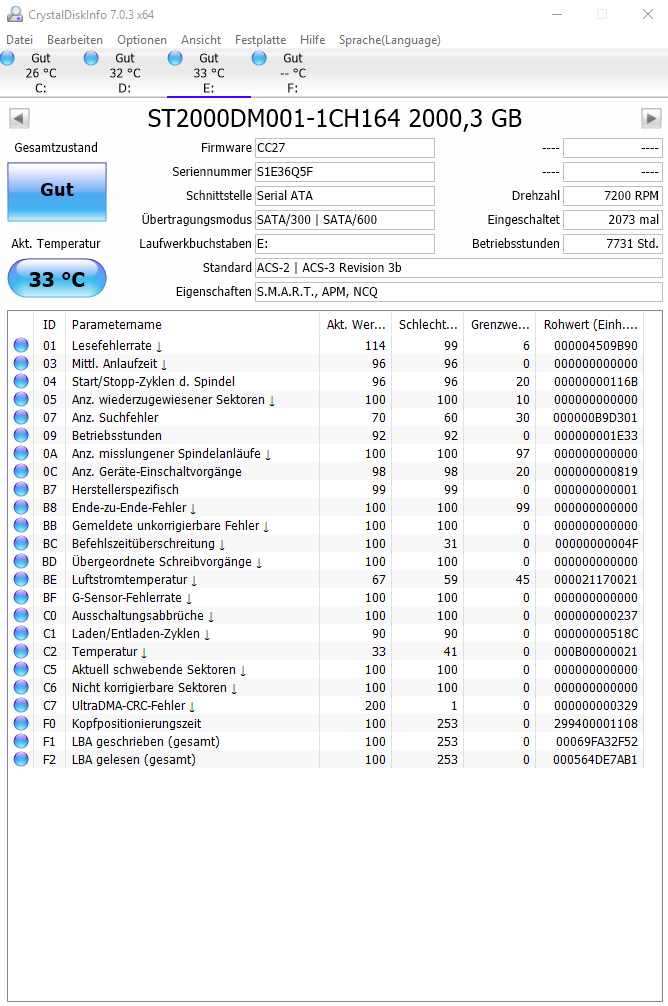 Doch, die hat nur eben diese Attribut 01 nicht, gerade bei den SSDs gibt es größere Abweichungen bzgl. der Attribute und auch deren IDs und Bedeutungen.Bierbank1 schrieb:bei mir werden irgendwie nicht alle Parameter/IDs angezeigt.