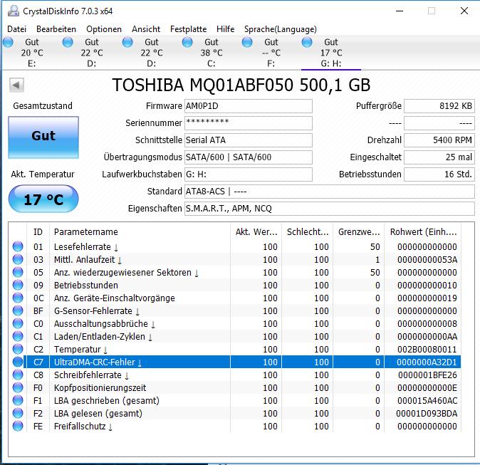 Dies war bei Dir der Fall, wenn keine Reservesektoren benutzt werden. Die Probleme hatten also ihre Ursachen nicht in Defekten der Oberfläche, sondern z.B. in Stromausfällen während Schreibvorgängen die dazu führten, dass eben nicht die ganze Daten mit der neuen ECC geschrieben wurden, es gab ja 0x19 = 25 Power Off Retracts, also solche unerwarteten Spannungsabfälle während die Köpfe nicht geparkt waren. Oder es wegen eines Stoßes oder Vibrationen beim Schreiben welche die Köpfe aus der Spur gebracht haben, so dass Daten auf der Nachbarspur überschrieben wurden, da sind ja offenbar viele HDDs im Rechner verbaut und dieses Modell ist dafür nicht gedacht und geeignet mit so vielen anderen HDDs zusammen in einem Gehäuse betrieben zu werden.