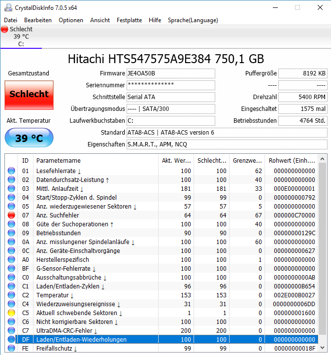 Mir ist vor Weihnachten meine Festplatte abgeraucht und ich habe mir jetzt eine 2TB FireCuda von Seagate geholt. CrystalDiskInfo und Easeus PartitionMaster geben nach Prüfung und Smart auslesen die neue Platte als Fehlerfrei aus. Nur empfinde ich die Festplatte als unangenehm laut (oder eher ungewöhnlich von den Geräuschen her), dafür dass meine alte Platte 5 Jahre alt war, finde ich das einen ganz schönen Rückschritt. Wahrscheinlich bin ich aber auch nur deswegen panisch, weil die Platte einfach per Brief gekommen ist, ohne Polsterung oder ähnlichem Schutz. Nicht mal in einem Karton, war also wirklich nur die Festplatte in einem Briefumschlag. Ich selber werde aus dem Wirrwarr nicht schlau, was mir CrystalDisk da ausgibt, vielleicht kann sich das mal jemand anschauen, der Ahnung hat. Was ich noch merkwürdig finde, ist das fehlen der Buffer Size. Die ist laut Hersteller bei 64MB, wird mir aber bei keinem der Programme angezeigt.