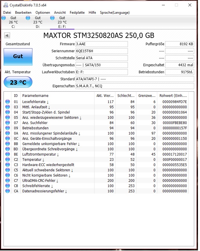 Ja, denn jeder Wert ist dort zu hoch, da dies der Zähler für Kommunikationsfehler zwischen dem SATA Host Controller und dem Controller der SSD ist. Die Übertragungen bei SATA werden mit einer CRC32 pro Paket (FIS) versehen und pro Datenpacket können bis zu 8192 Byte Nutzdaten übertragen werden. Wenn es einen Fehler gab, muss die Übertragung wiederholt werden und entsprechend langsam wird die SSD, wobei der Rohwert von C7 nicht bei allem SSDs und HDDs wirklich jeden Fehler zählen dürfte, sonst würde er schnell sehr hoch stehen.MrBu schrieb:Ist der Wert für C7 zu hoch?