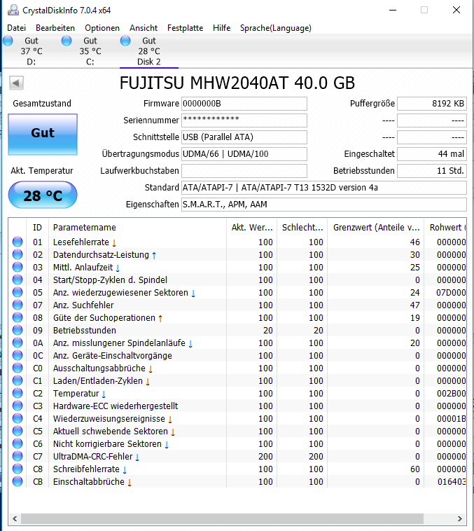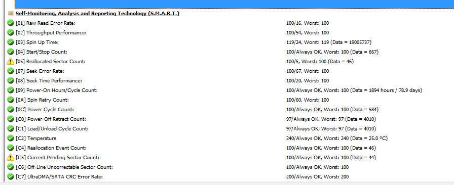 46 wiederzugewiesene und 44 schwebende Sektoren, gar nicht so wenig und meist ein schlechtes Zeichen, aber es muss noch nicht das Todesurteil sein. Backups hast Du hoffentlich, die sollte man immer haben und nicht erst anlegen, wenn man die ersten Probleme bemerkt, dann ist es eigentlich auch schon Datenrettung statt Datensicherung.