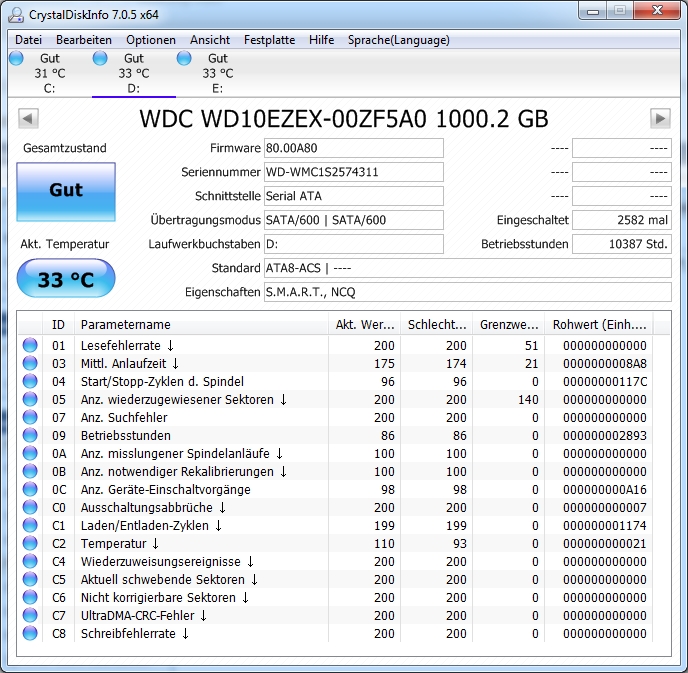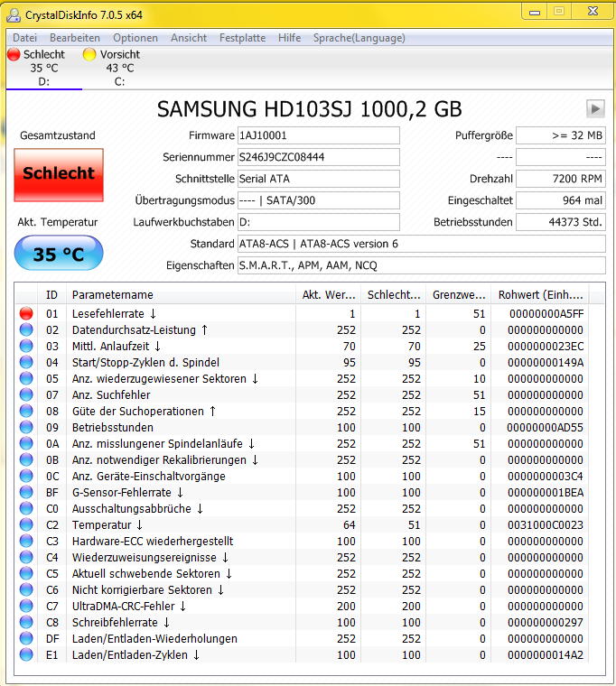 @joe522: das war das SATA Kabel der WD30, wahrscheinlich locker, es sind 1.816 CRC Fehler verzeichnet (ID-C7), die sind aber nicht mehr aktuell zumindest seit dem letzten Boot.