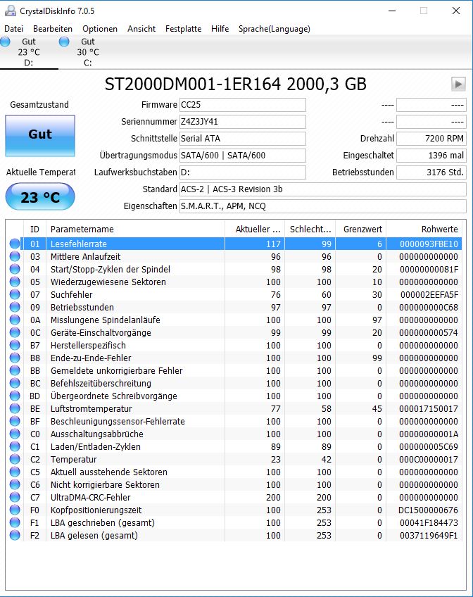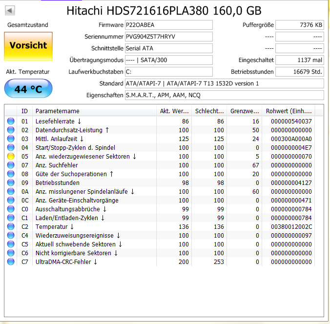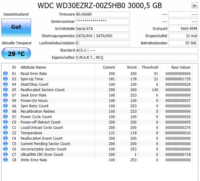 Nun hab ich aber noch ein paar Monate Garantie (in Zahlen 5) und möchte lieber nichts riskieren, nicht dass meine Festplatte nach Garantie-Ende plötzlich ganz abschmiert. Meinte mein Bruder daher, ich solle hier mal die mit CrystalDiskInfo ausgelesenen Werte posten: