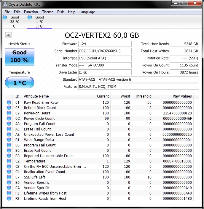 Die Windows 7-Partitionen "System-reserviert" und "Win7SSD" (C: ) werden einwandfrei erkannt, auch CrystalDiskInfo kann alle Werte bis auf Temperatur (USB Problem!?) auslesen: